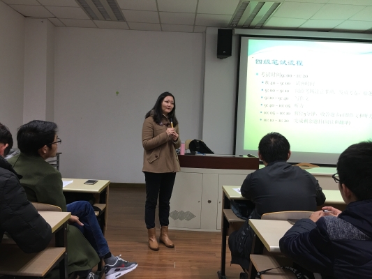 讲座伊始,赵老师对在座同学四级备考的情况进行现场了解。部分同学表示已经完成了3-4套真题,有的同学着重进行阅读训练,但是不少同学表示并不了解四级考试的实际流程。于是,赵春雨老师从四级笔试流程入手,通过各个考试模块清晰的时间截点和具体内容,让大家提前感受到真实考场的紧密气氛。